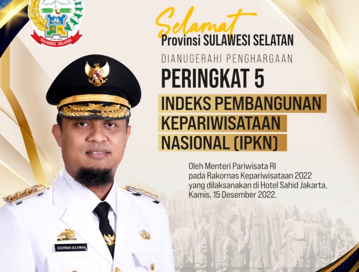 Gubernur Sulsel, Andi Sudirman Sulaiman mengatakan, “Alhamdulillah, Sulsel termasuk 5 besar peringkat Indeks Pembangunan Kepariwisataan Nasional (IPKN) tahun 2022, dengan nilai 3,99,” katanya, Jum’at (16/12/2022).