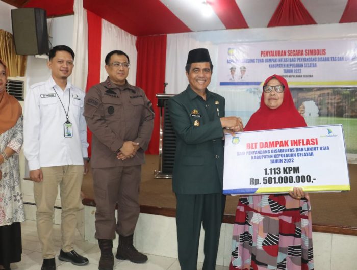 SELAYAR, WASPADAPOS.COM- Wakil Bupati Kepulauan Selayar H. Saiful Arif, S.H menyerahkan bantuan langsung tunai (BLT) dampak inflasi bagi penyandang disabilitas dan lanjut usia di Baruga Dekrnasda, Kamis (22/12/2022).