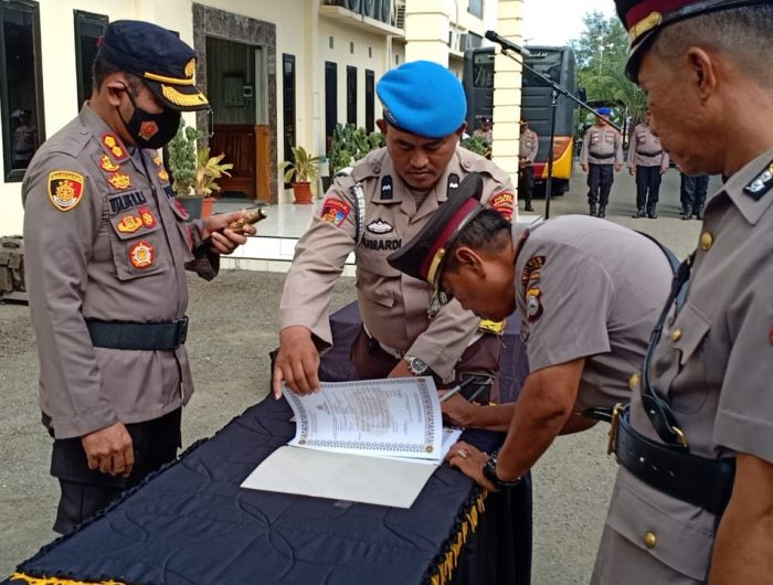 Seremoni serah terima Jabatan, dilakukan dengan penyematan tanda Jabatan kepada Pejabat Baru oleh Kapolres, penandatanganan berita Acara dan fakta integritas.