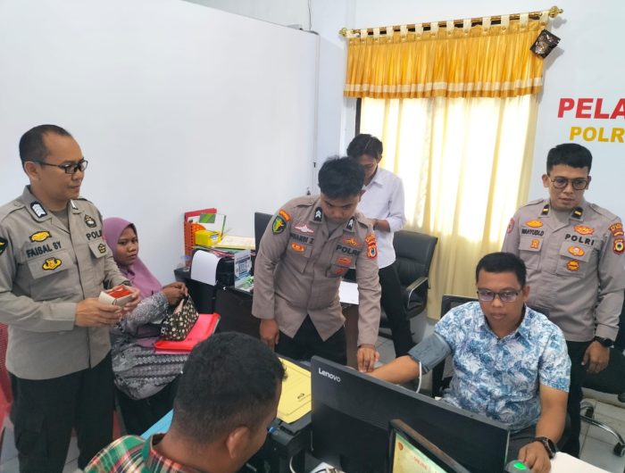 Waspadapos– Di tengah padatnya pelayanan Surat Keterangan Catatan Kepolisian (SKCK) untuk pemenuhan syarat Daftar Riwayat Hidup (DRH) PPPK, para operator dan petugas loket SKCK Polres Kepulauan Selayar mendapat pemeriksaan kesehatan dan pemberian vitamin dari Urkes Polres Selayar, Senin (15/9/2025).