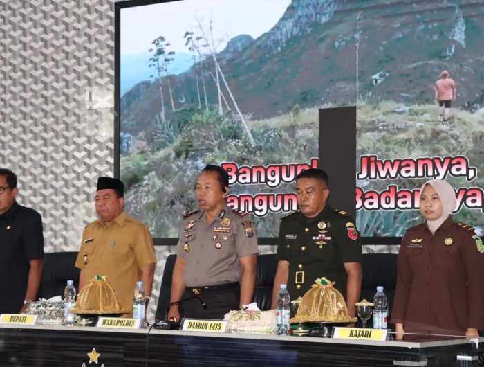 Rapat dipimpin oleh Wakapolres Kepulauan Selayar Kompol Kaharuddin, S.E., S.H., M.M., dan dihadiri Wakil Bupati Kepulauan Selayar Drs. H. Muhtar, M.M., Ketua DPRD Kepulauan Selayar H. Mappatunru, S.Pd., unsur TNI dari Kodim 1415/Selayar dan Pos TNI AL, perwakilan Kejaksaan Negeri, para pejabat utama Polres, serta pimpinan perangkat daerah terkait seperti Dinas Pariwisata, Dinas Kesehatan, FKUB, dan instansi pendukung lainnya.