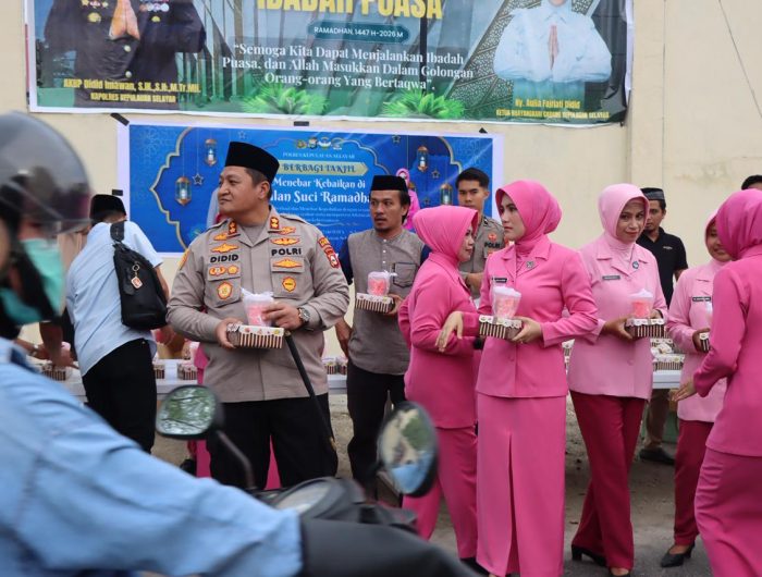 Waspadapos-Suasana penuh kehangatan dan kebersamaan mewarnai sore hari di depan Mapolres Kepulauan Selayar ketika Kapolres Kepulauan Selayar AKBP Didid Imawan, S.IK.,S.H.,M.Tr.Mil., bersama Ketua Bhayangkari Cabang Kepulauan Selayar Ny. Aulia Fajriati Didid turun langsung ke jalan membagikan takjil kepada masyarakat yang melintas, Jumat sore (06/03/2026).