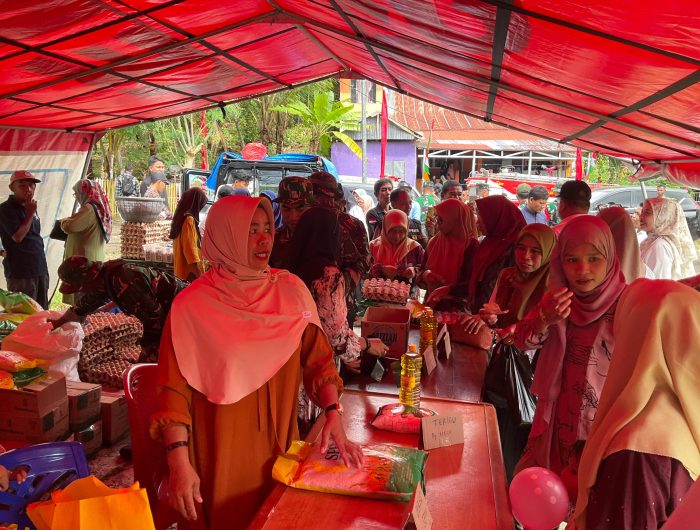 Warga memadati Pasar murah TMMD dikarenakan penjualan sembako dengan selisih harga yang cukup signifikan membantu mengurangi beban pengeluaran rumah tangga warga.